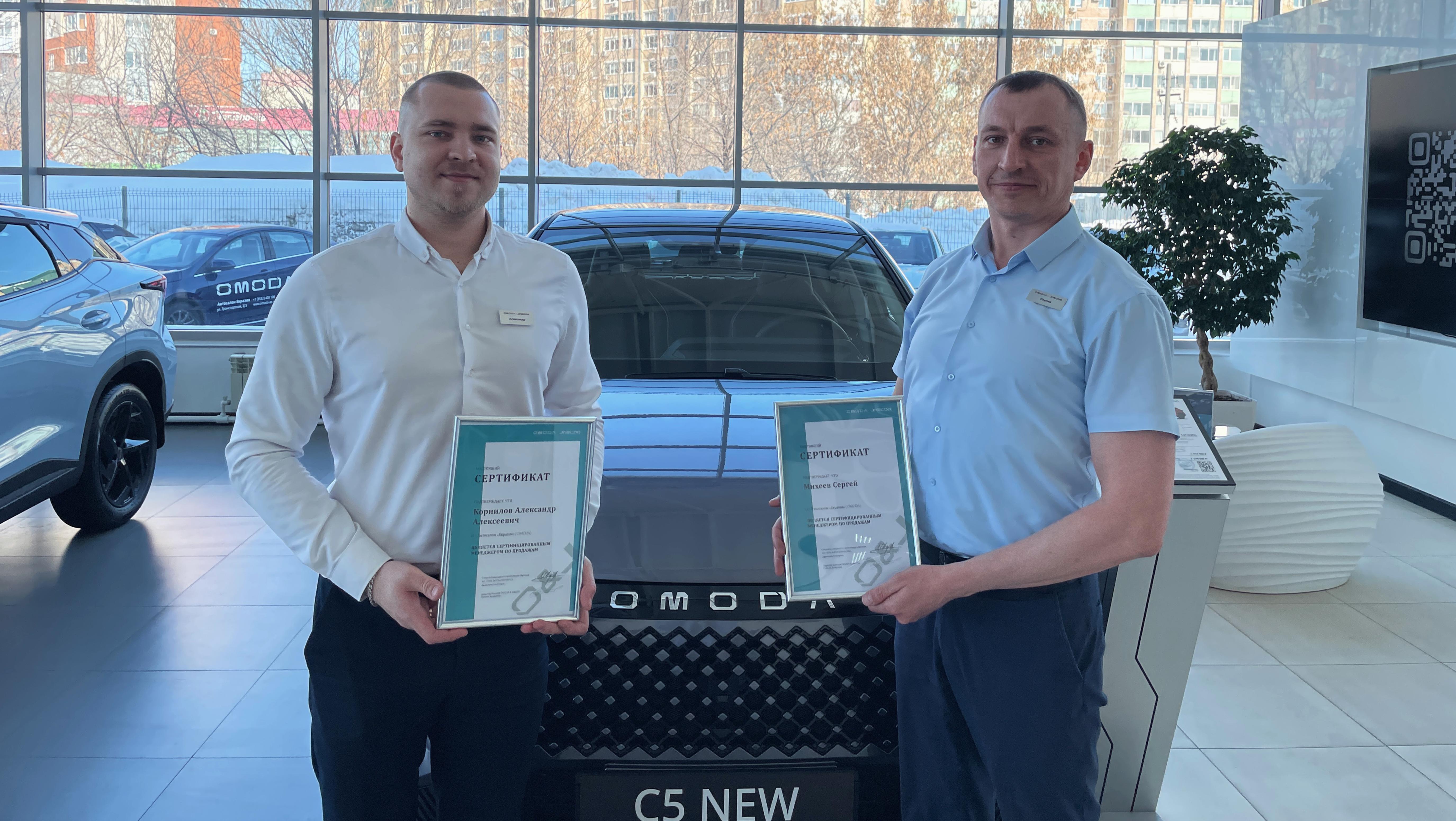 Именно поэтому мы с гордостью сообщаем, что менеджеры Автосалона Евразия Корнилов Александр и Михеев Сергей успешно прошли сертификацию по стандартам продаж автомобилей брендов OMODA и JAECOO.